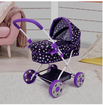 Цей чарівний візок — справжня знахідка для маленьких матусь! Стильний принт із зірками на темно-фіолетовому тлі та зображенням милого кролика створює атмосферу казкової прогулянки. Ідеально підходить для сюжетно-рольових ігор, розвиває турботливість, уяву та емоційний інтелект.