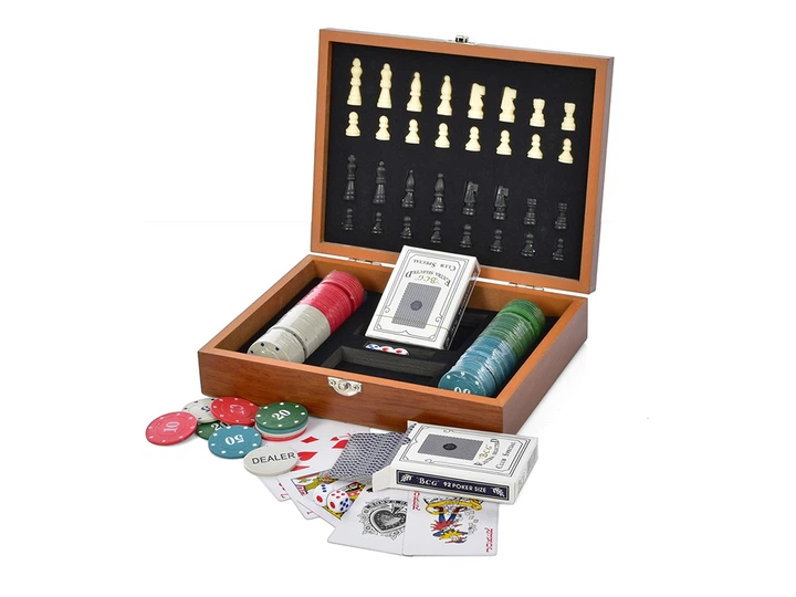 Цей універсальний набір поєднує дві класичні гри — інтелектуальні шахи та азартний покер — у компактному дерев’яному футлярі. Верхня частина коробки — це шахова дошка, а всередині — фішки, карти та кубики для покеру. Ідеальний варіант для подарунка, подорожей або домашніх вечорів у компанії друзів.