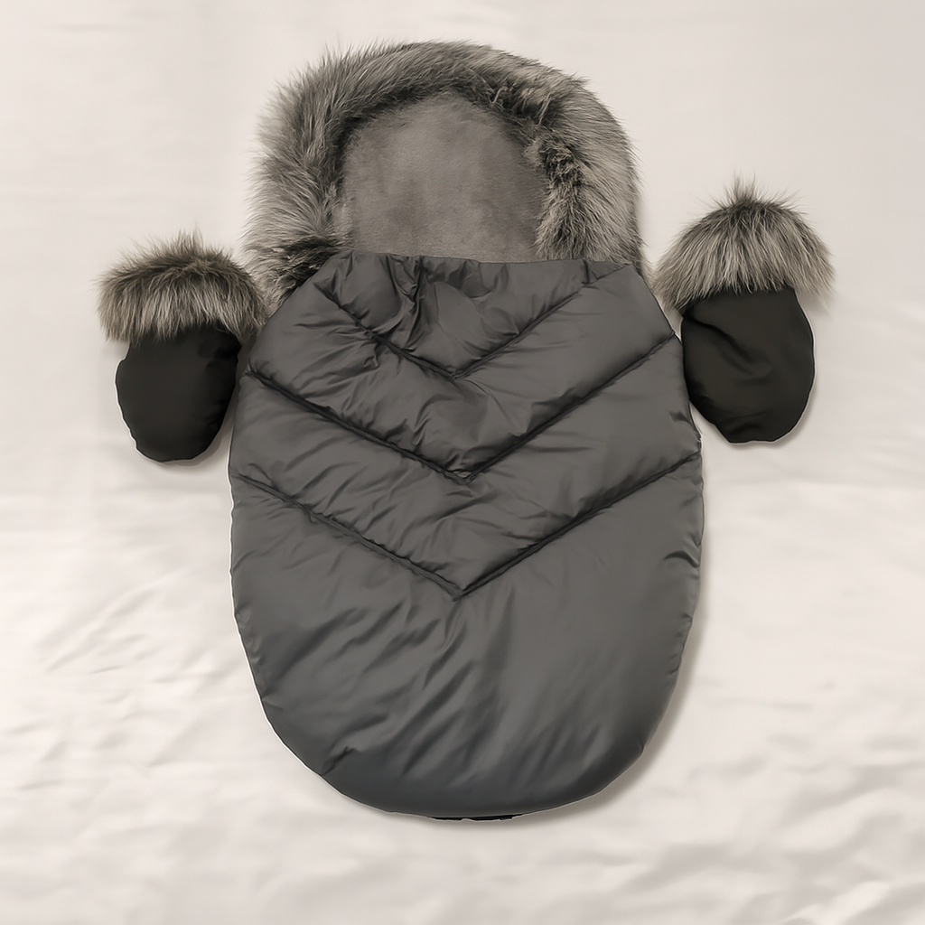 Цей набір створений для затишних прогулянок у холодну пору року. Сірий конверт із водонепроникної тканини надійно захищає дитину від морозу, вітру та снігу, а м’яка підкладка з холофайберу дарує тепло та комфорт. Муфта-рукавички на магнітах — це зручність і тепло для мами: руки завжди в захисті, а доступ до коляски — швидкий і легкий.